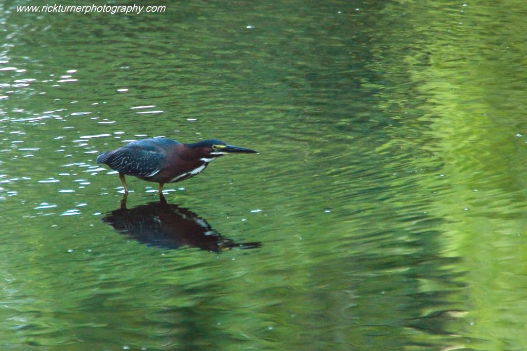 A small, stocky wading bird, the Green Heron is common in wet spots across much of North America. It can be difficult to see as it stands motionless waiting for small fish to approach within striking range, but it frequently announces its presence by its loud squawking.